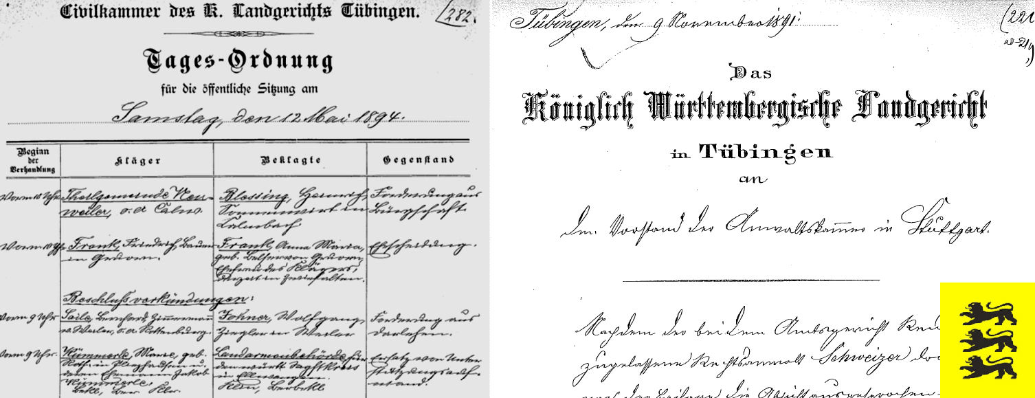Umfangreiche, reich bebilderte lokale Informationen zum Tübinger Gericht enthält eine zweibändige Gesamthistorie (Volltextdownload durch Anklicken der Titelseiten unten). Für Schülerinnen und Schüler, die an einem Rechtsberuf interessiert sind, steht seit dem Jubiläum das blaue Informationsheft zur Verfügung).